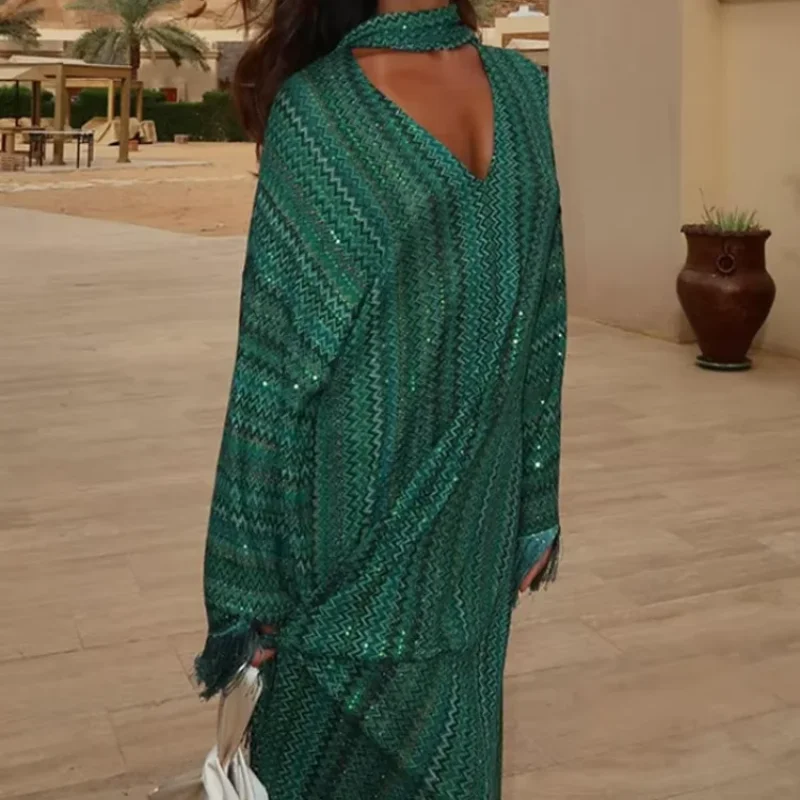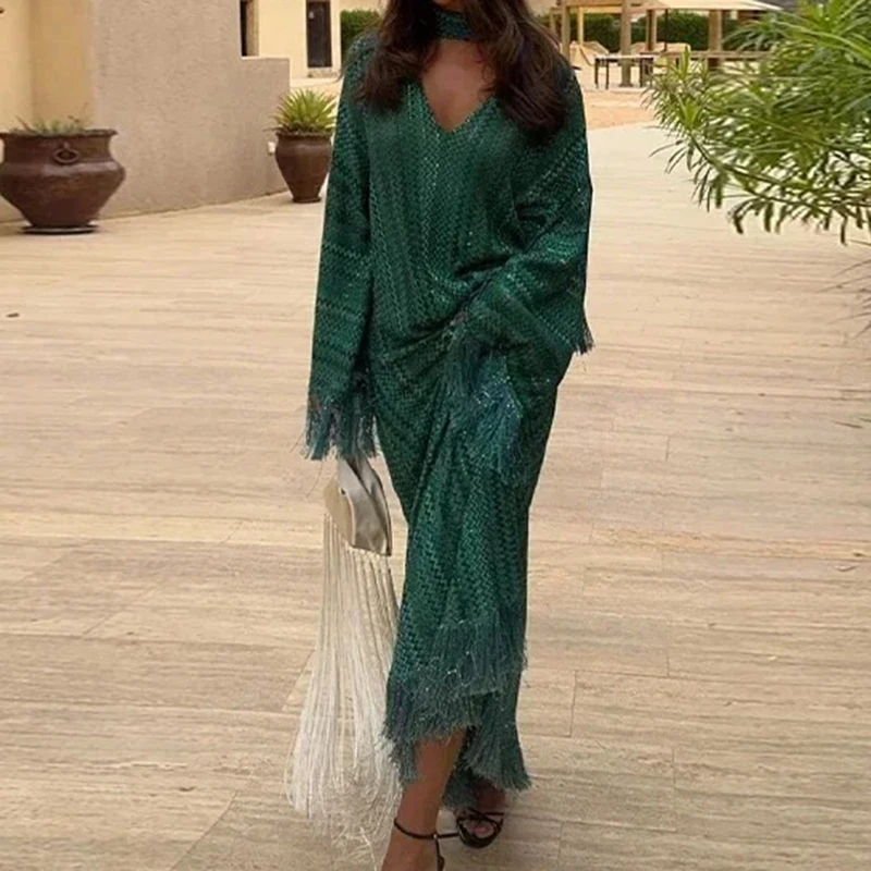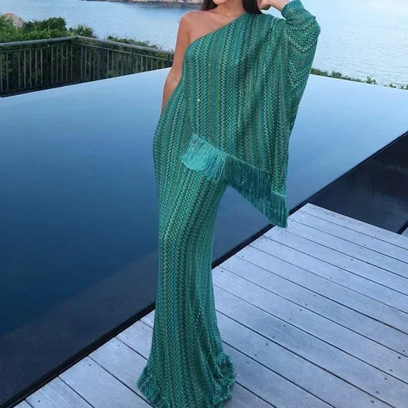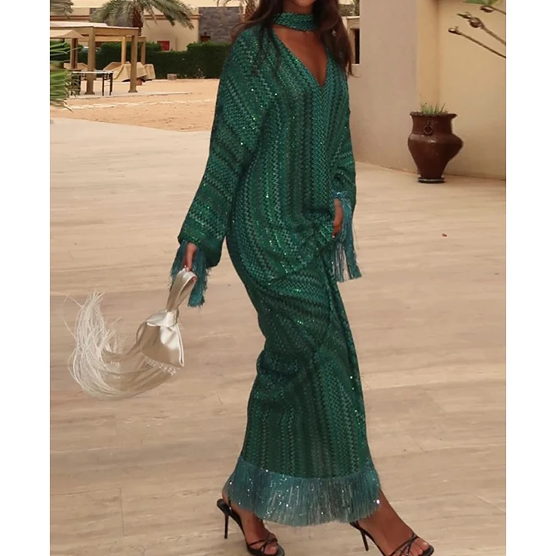 2025 Vintage Glam Off-Shoulder Maxi Dress for Women – Elegant Striped Tassel Design with Matching Scarf, Long Sleeve Evening Party Gown