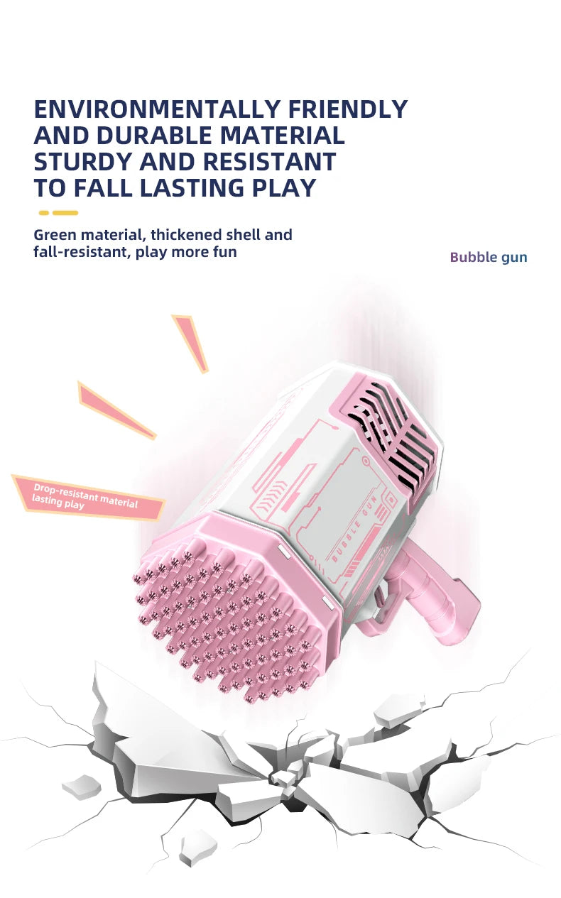 The bubble launcher features 69 bubble holes that produce thousands of colorful bubbles per minute. Built-in colorful lights add extra fun, especially during nighttime play.