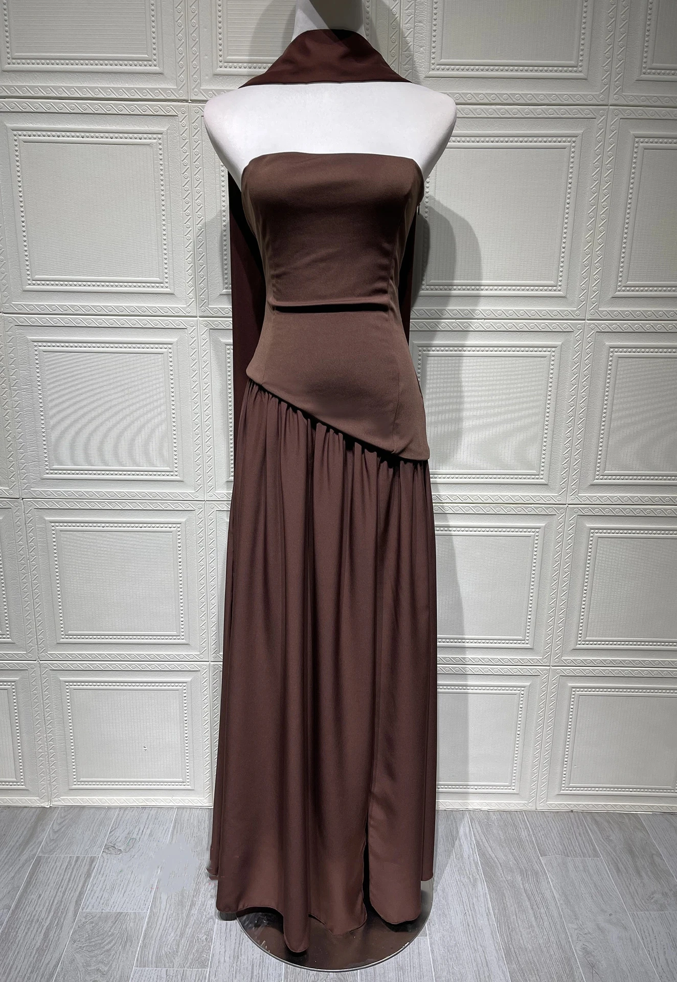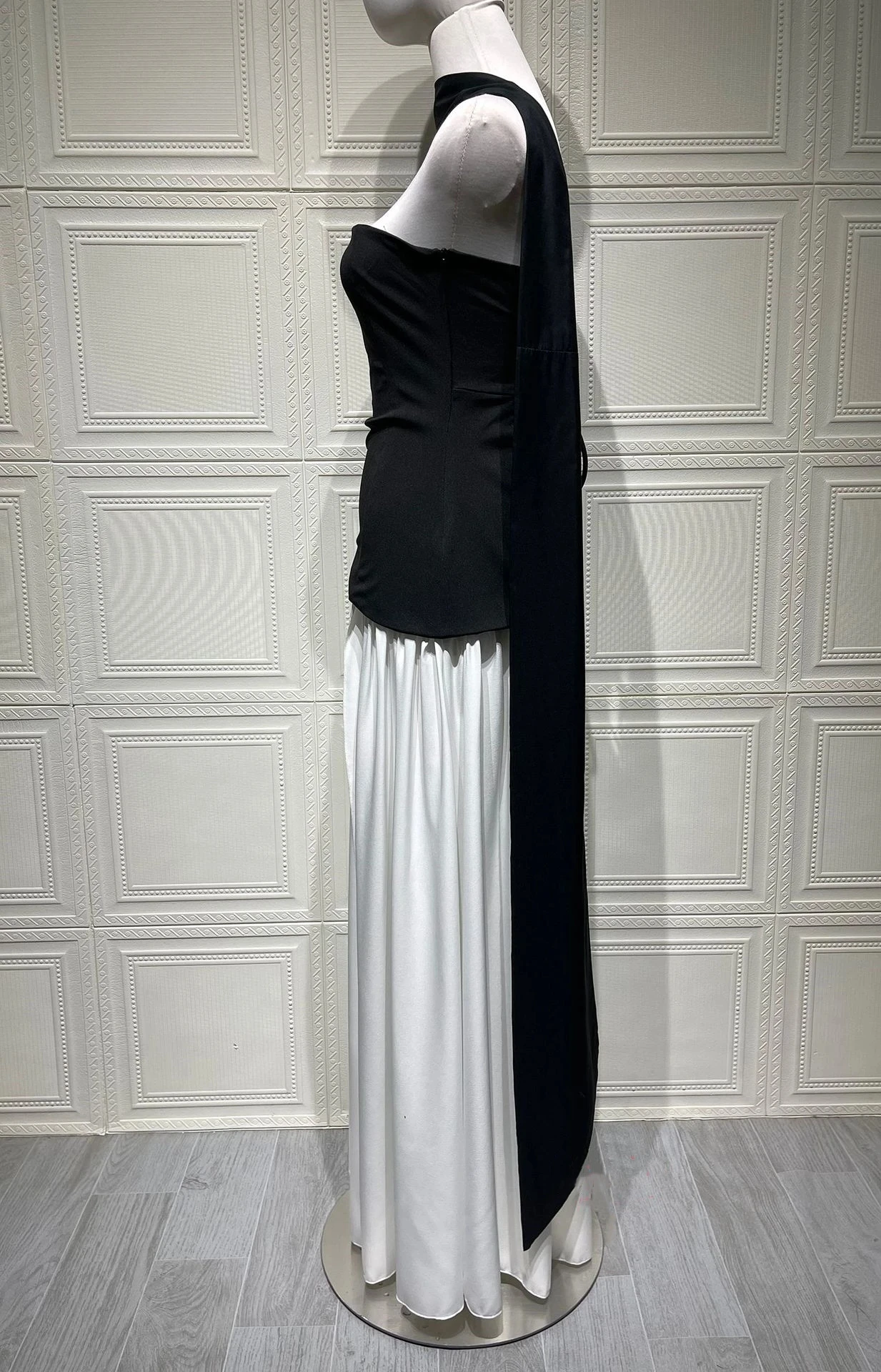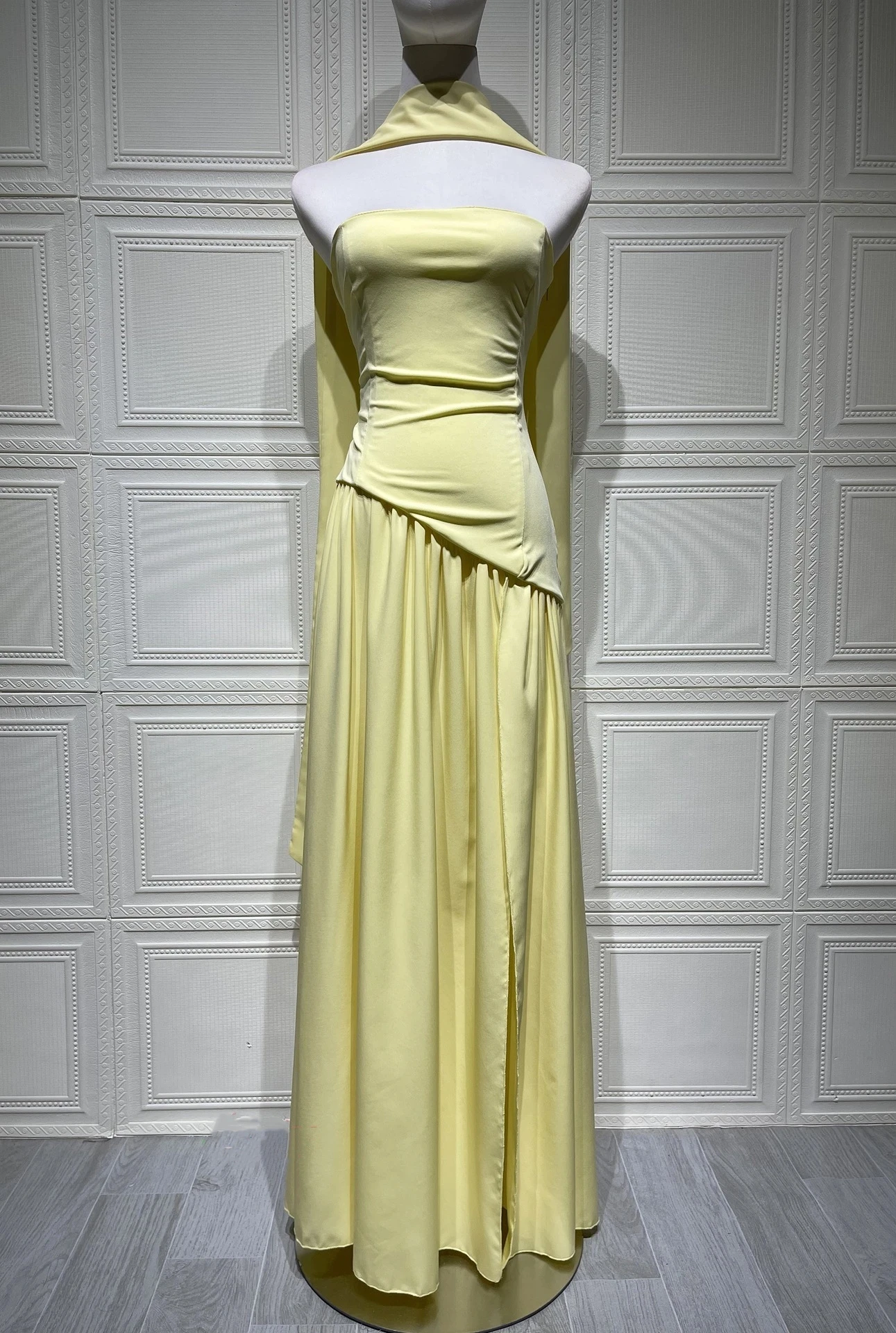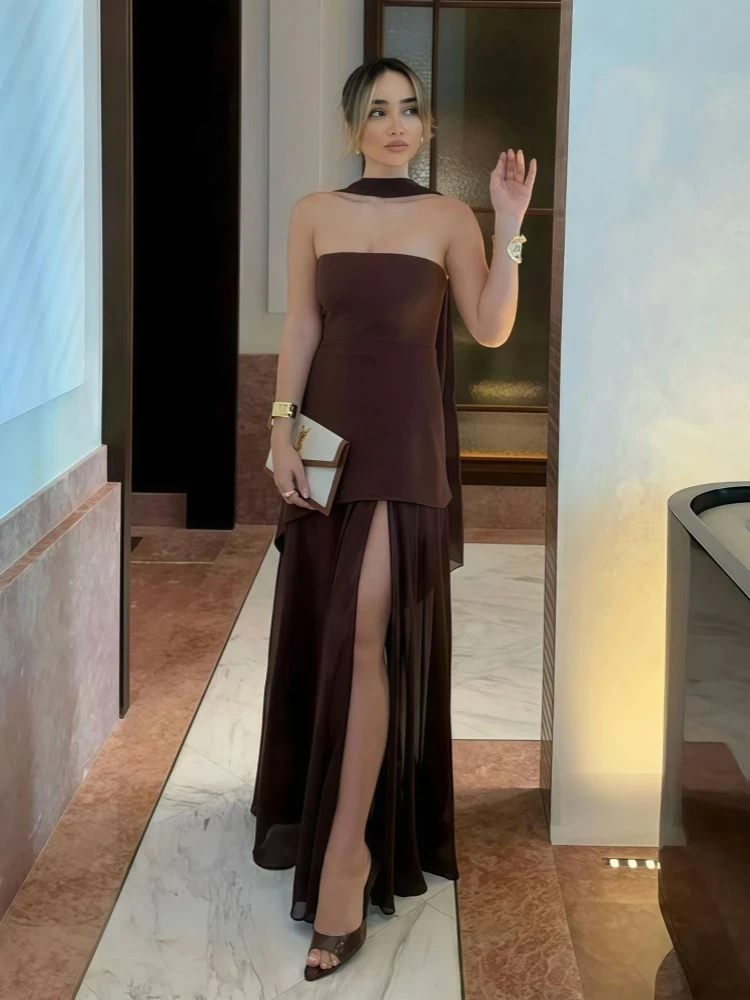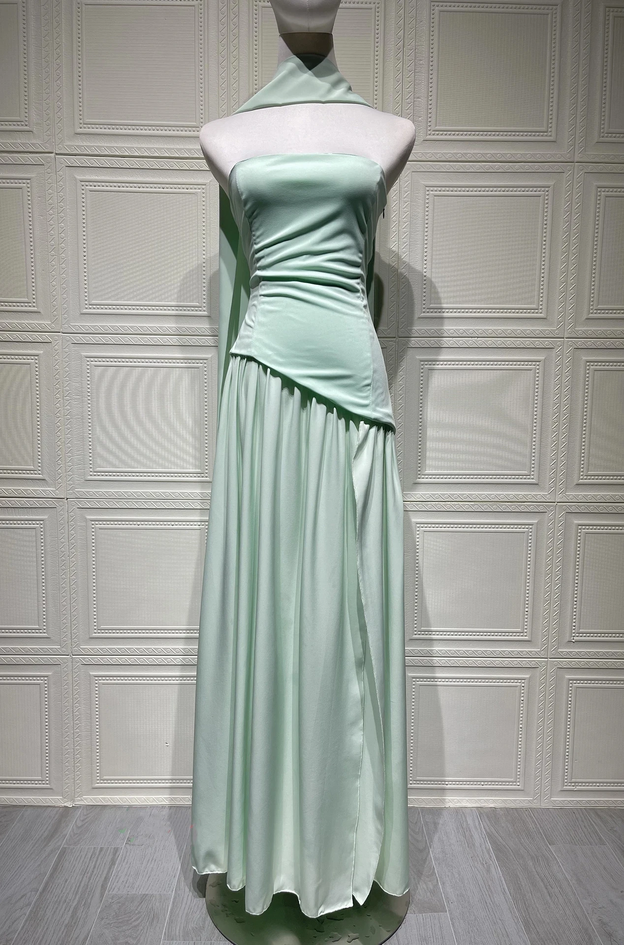Elegant Pleated Long Dress for Women – Off-Shoulder, Scarf Neck, High Slit | Party & Evening Gown