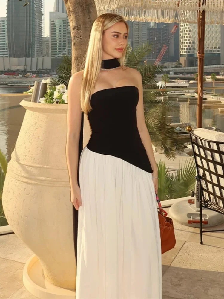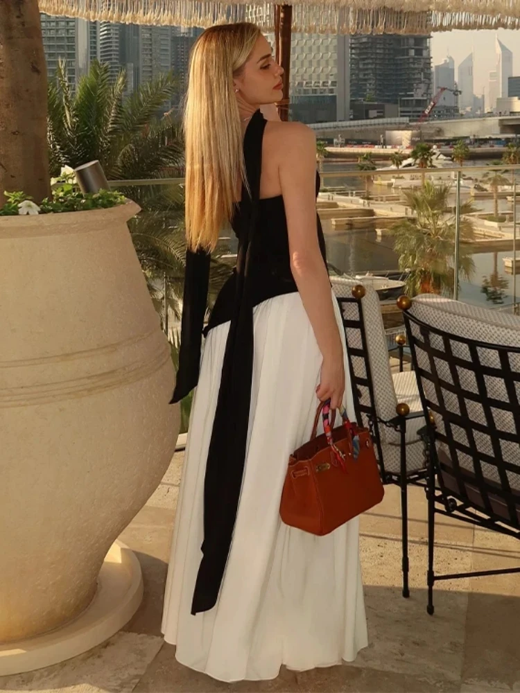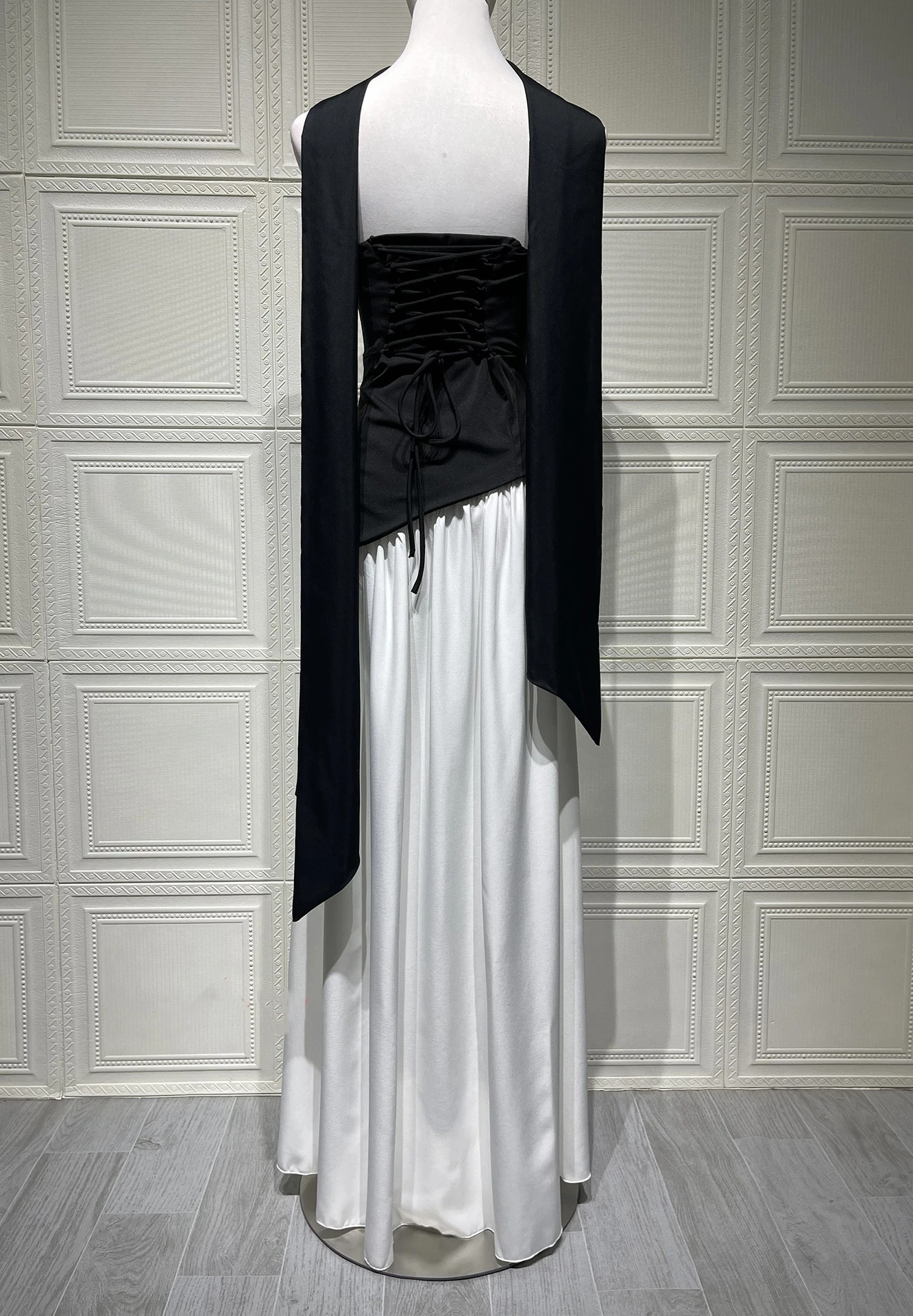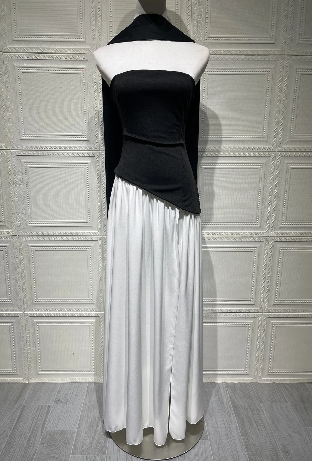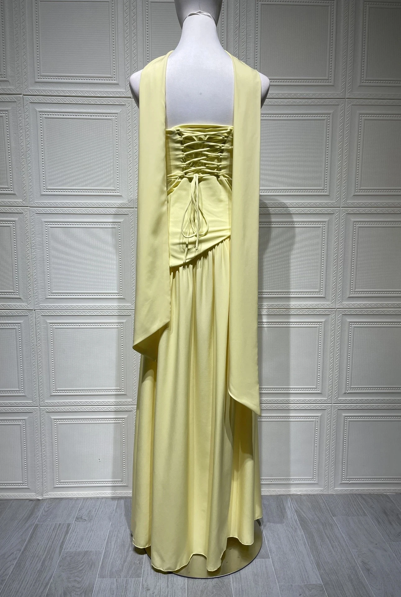 Elegant Pleated Long Dress for Women – Off-Shoulder, Scarf Neck, High Slit | Party & Evening Gown